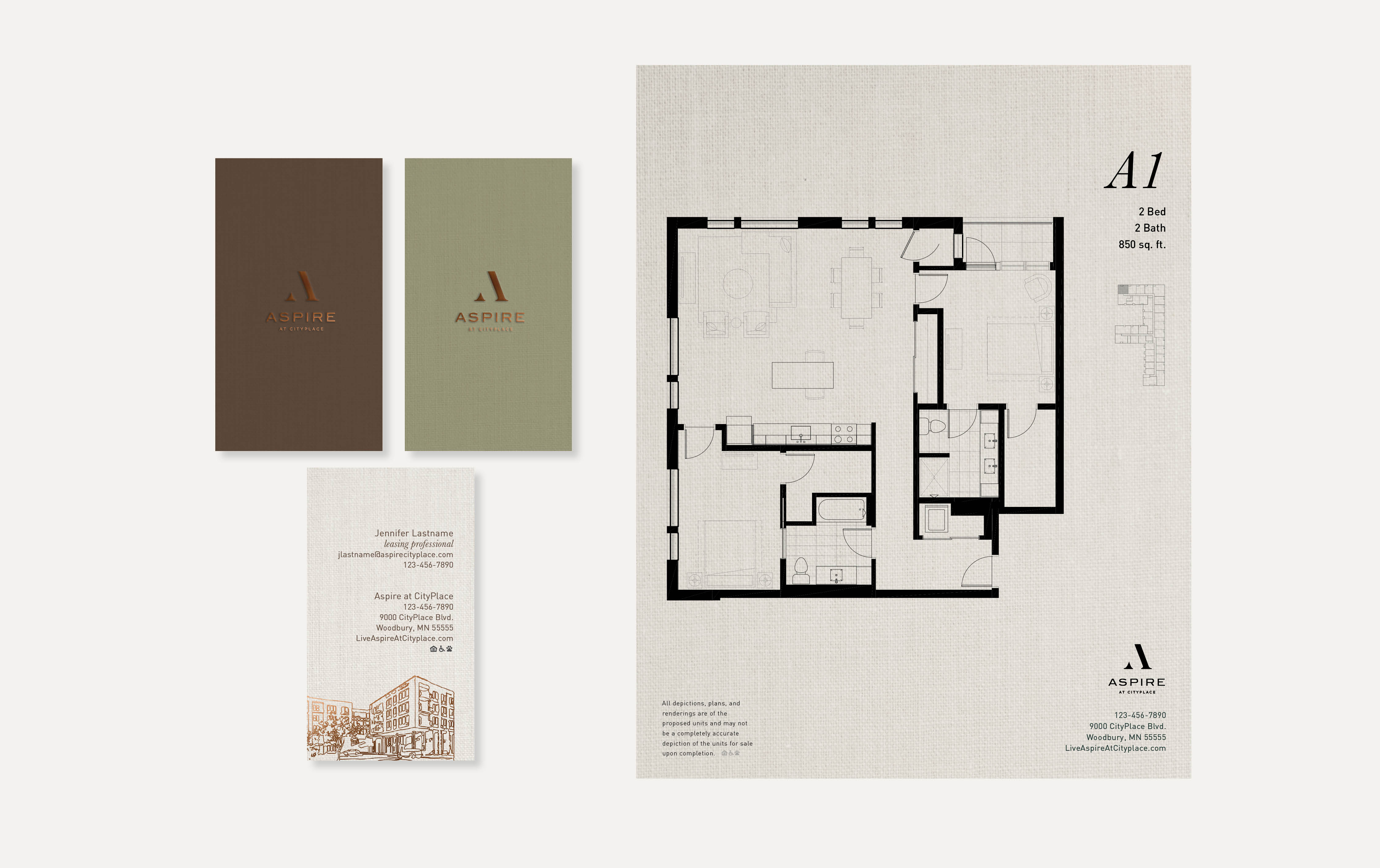 This was the selected concept for the luxury apartment building, Aspire at CityPlace. My involvement on this project included brand identity, and website.