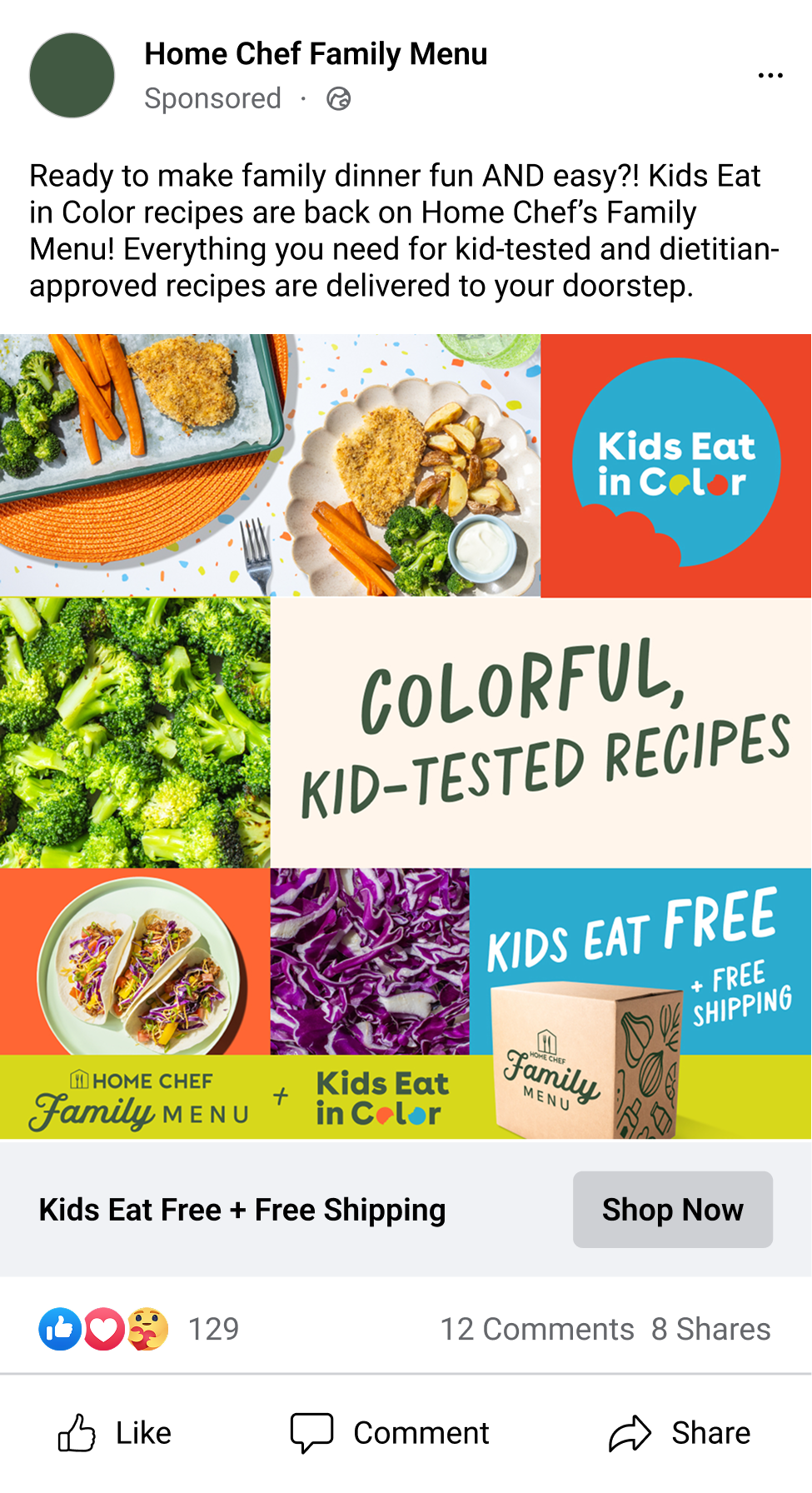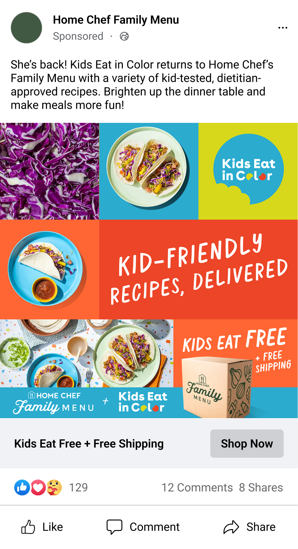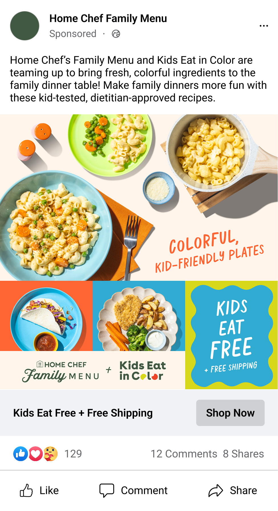 Created 28 meta ads to be shared from Home Chef, Kids Eat in Color, and Kroger Handles. These ads ran on Facebook and Instagram.