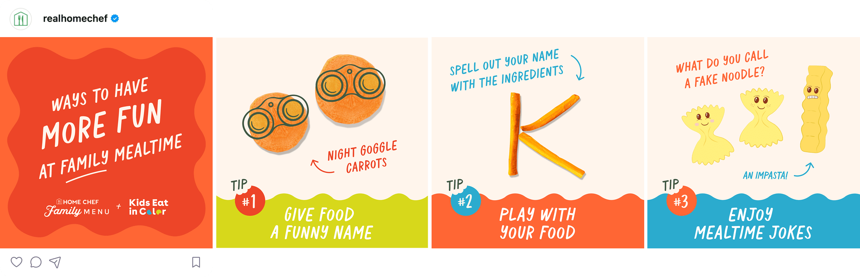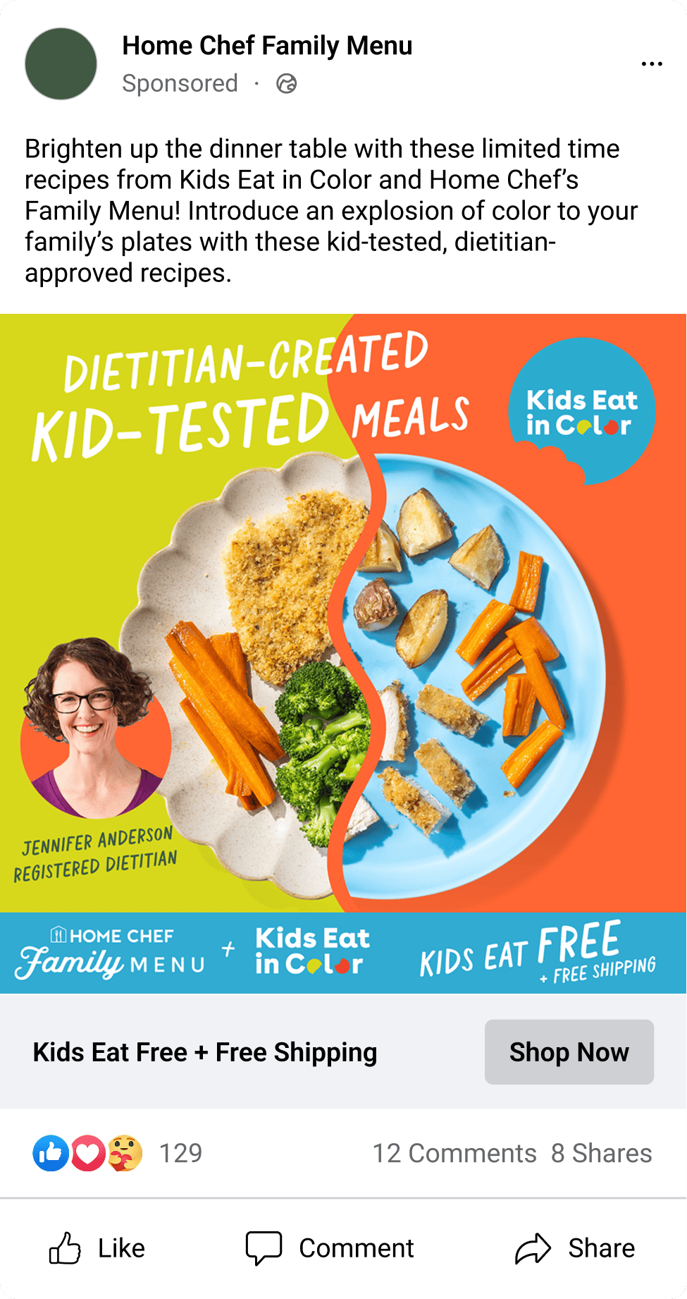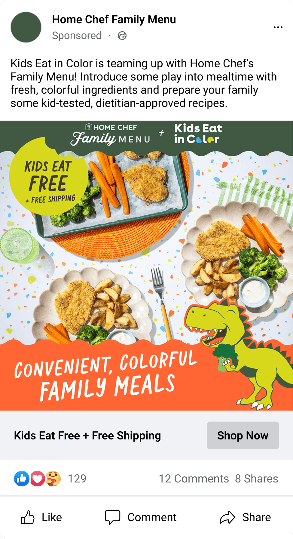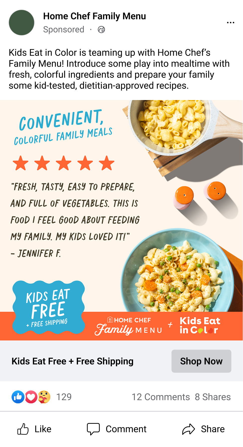 Created 28 meta ads to be shared from Home Chef, Kids Eat in Color, and Kroger Handles. These ads ran on Facebook and Instagram.