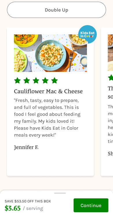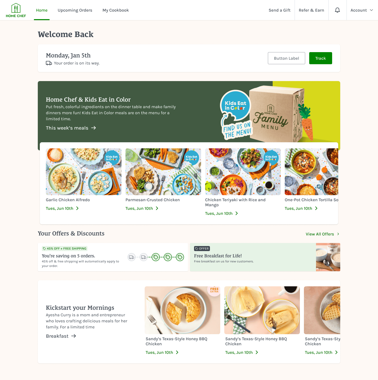 Banners displayed in customers dashboard promoting the partnership, review of meals from 1.0 partnership, and meal promo at the bottom of the Home Chef Family website.